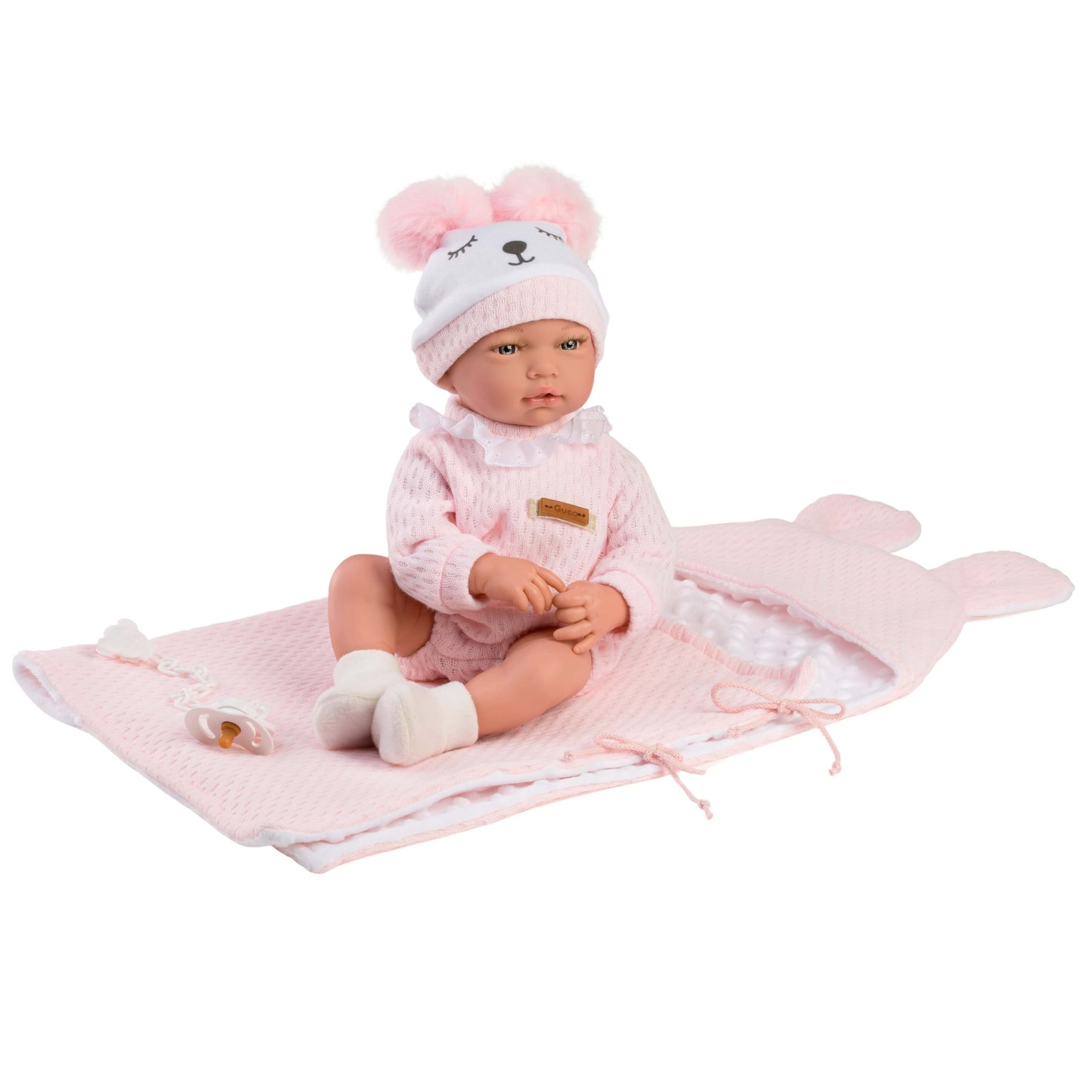 Capucine est une poupée reborn fille qui incarne la douceur et l’innocence. Sa combinaison en laine rose, finement complété par une bande brodée blanche au col, évoque la tendresse des premières fleurs du printemps. Ses petites chaussettes en laine et son bonnet assorti, orné d’une adorable face d’ours et de deux pompons, enveloppent Capucine d’une aura de chaleur et de fantaisie.