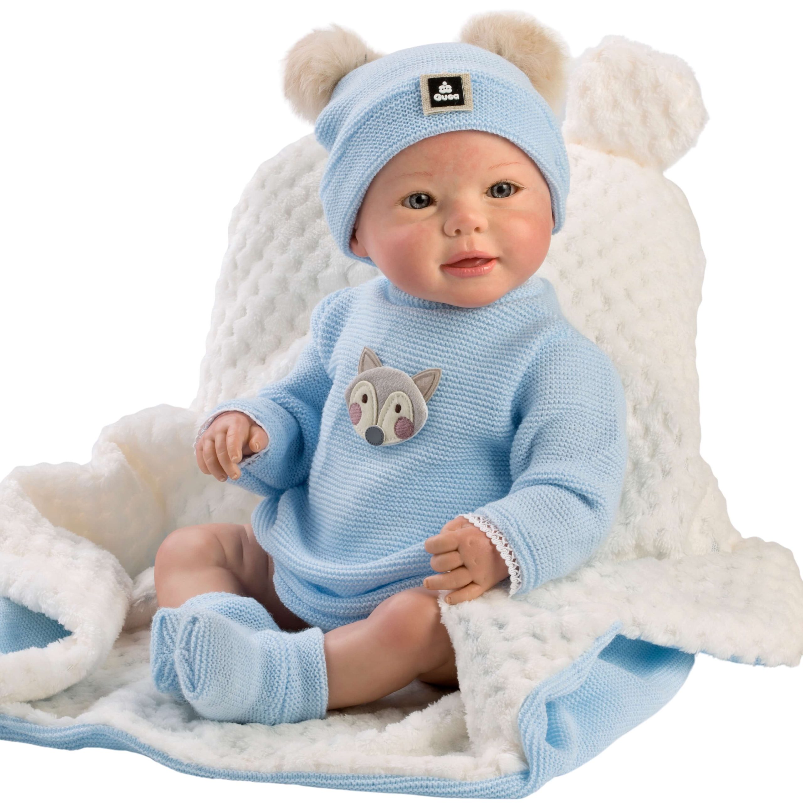 Vêtu d’un pelele en laine bleue orné d’une adorable carita de mapache en tons gris et beige, complété par un bonnet à pompons beiges et des chaussons assortis, Adam est l’image même de l’innocence. Une manta en laine bleue vient envelopper ce petit trésor de chaleur et de confort.