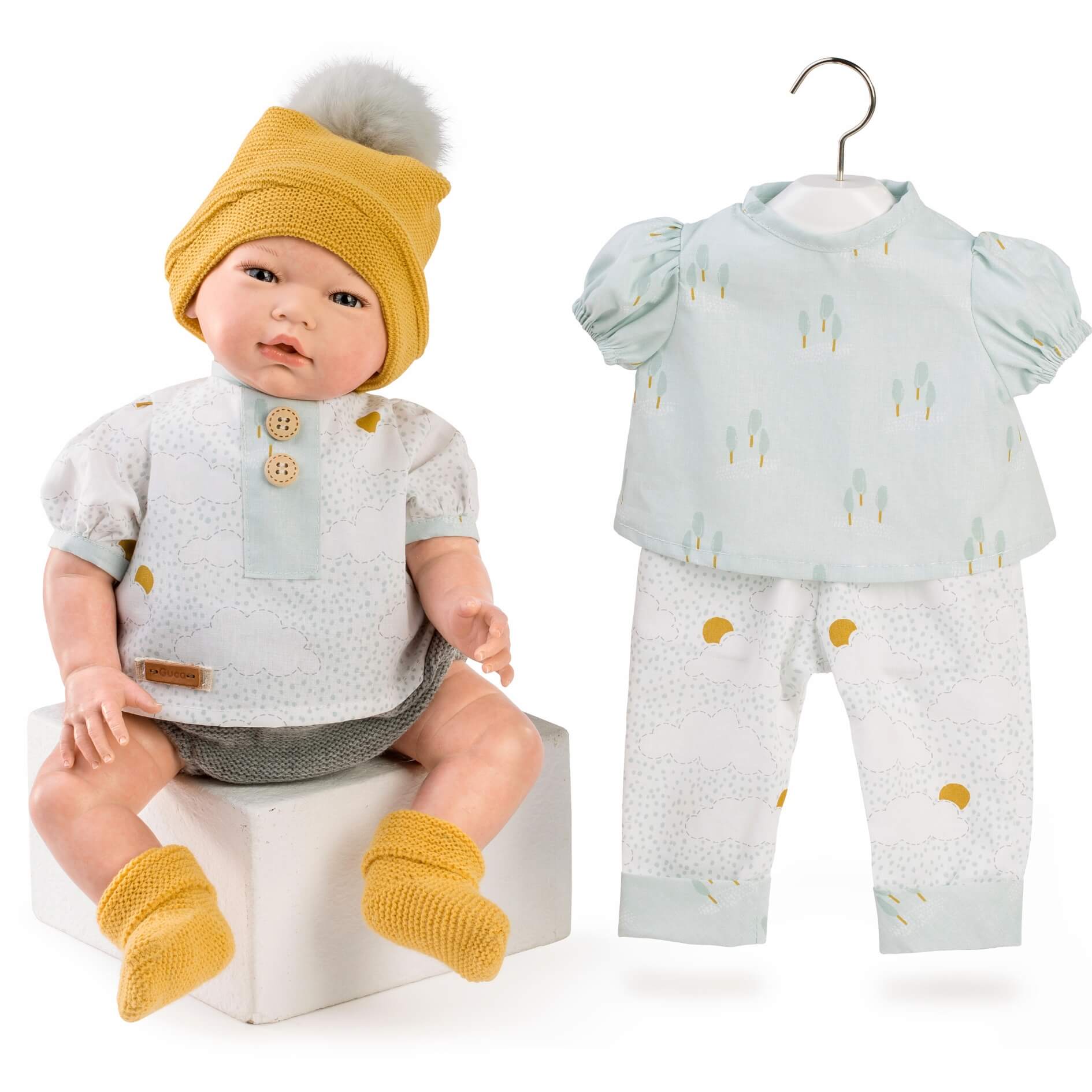 Cette poupée reborn de 42 cm, dépourvue de cheveux pour une simplicité émouvante, est un véritable chef-d’œuvre, pesant environ 2,2 kg pour simuler la sensation d’un véritable nourrisson dans vos bras. Habillé avec goût d’un haut en popeline, il se distingue par ses chaussons et son bonnet en laine, ajoutant une note de chaleur et de style. Un ensemble supplémentaire, composé d’une camisa et d’un pantalon en popeline aux couleurs harmonieuses, offre une diversité de tenues adorables. Charles est également accompagné d’un pañal pour une expérience de jeu encore plus authentique.