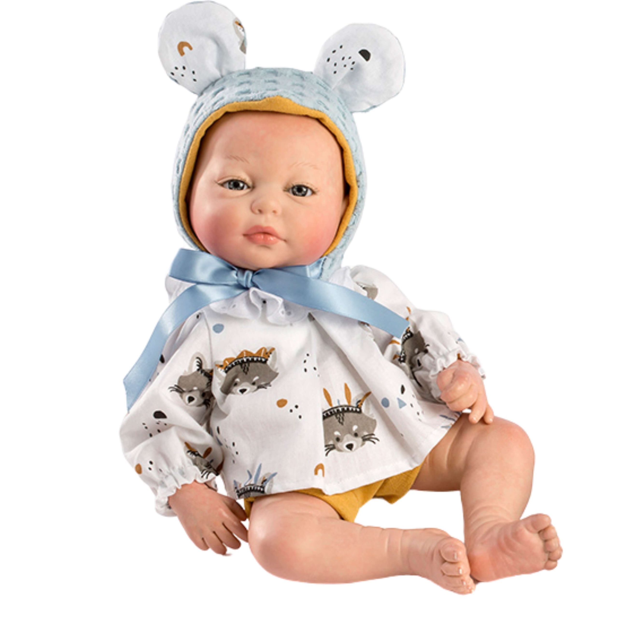 Vêtu avec goût, Leylo arbore une chemise blanche à motif de raton laveur et un pantalon court tricoté jaune moutarde tendance. Sa capuche bleue, ornée de petites oreilles et d’un joli nœud, complète son look avec fantaisie. Pour les déplacements, il dispose d’un porte-bébé bleu coordonné à son ensemble, ce qui facilite le transport tout en style.