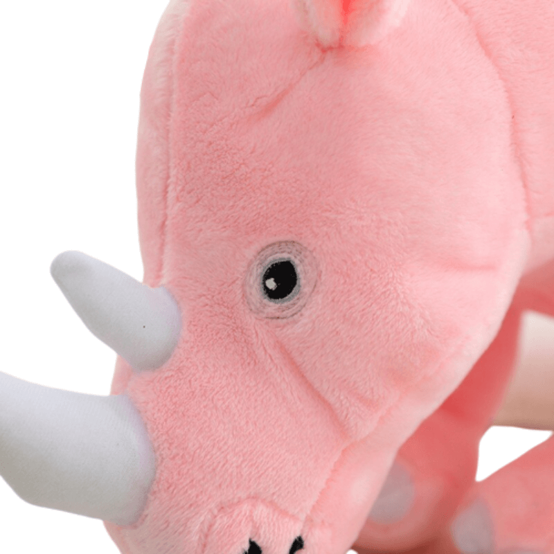 Notre doudou rhinocéros a été représenté avec une touche d’originalité. Sa couleur rose recouvre tout de même des détails incontournables de l’animal ! Un corps musclé, une défense blanche ainsi que de grosses pattes. N’oublions pas son magnifique regard expressif qui paraît nous demander des câlins sans modération !